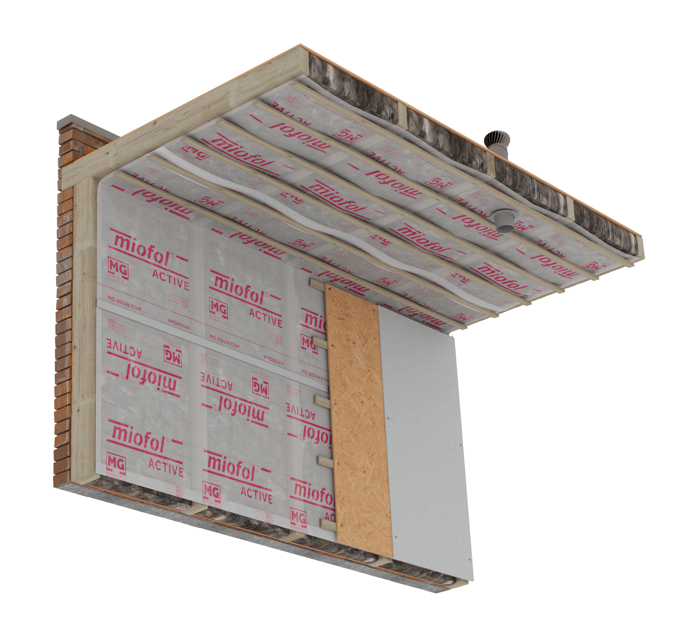 • Het membraan heeft een dubbele functie: ’s winters wanneer het binnen warmer is dan buiten loopt de dampstroom van binnen naar buiten