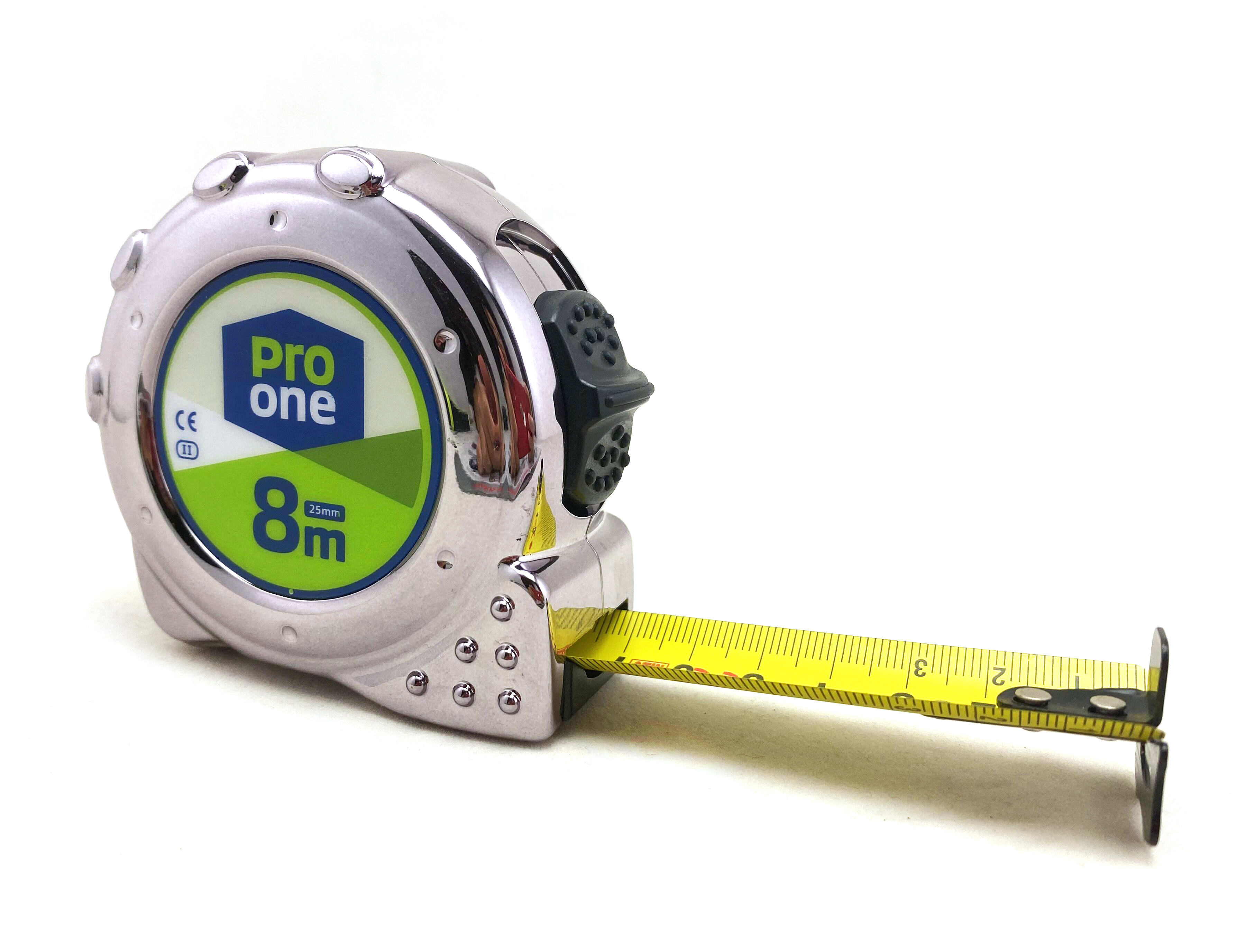 Pro One Rolbandmaat 8 meter. Dubbelzijdige aflezing. ABS-chrome behuizing. UV-coating. Dubbele eindhaak met 3 klinknagels.